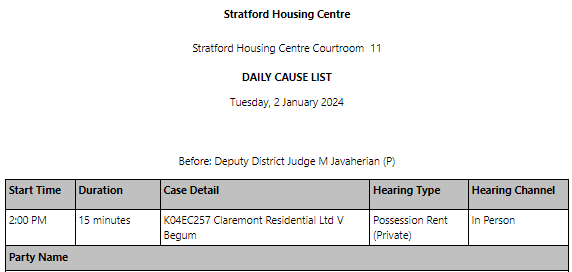 How about this possession case at the Stratford Housing Centre with ‘private’ in the hearing type … is this open to the public?