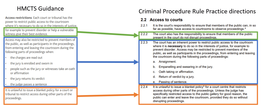 Crim PD 2.2.1: “It is the court’s responsibility to ensure that members of the public can, in so far as possible, have access to courtrooms to observe proceedings.“